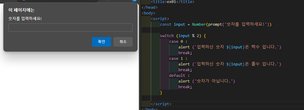 == 변수에 저장된 값은 switch 문을 만나면 케이스의 값을 검사를 하고 일치하는 값이 있으면 해당하는 코드를 실행하다. switch 문은 if 문과 다르게 특정조건에 만족했을 때 블록을 스스로 빠져나가지 못해 berak문을 사용하여 switch 문을 종료한다. 만약 값 중 일치하는 데이터가 없으면 default에 있는 코드를 실행하고 종료한다.